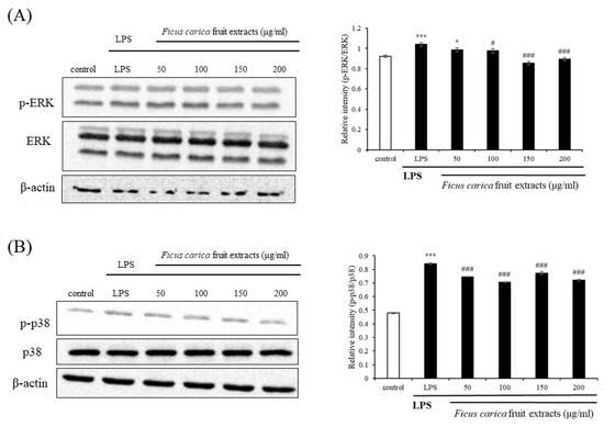 Effect of F. carica fruit extracts on the phosphorylation of mitogen-activated protein kinase (MAPK) cascade (p-ERK 1/2 and p-p38) in LPS-stimulated RAW 264.7 cells. The expressions of p-ERK 1/2 (A) and p-p38 (B) were analyzed with ImageJ and normalized against β-actin. All data are expressed as mean ± SD * p < 0.05, *** p < 0.001 compared with control group, # p < 0.05, ### p < 0.001 compared with LPS group. All experiments were performed in triplicate.