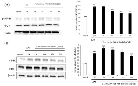 Effect of F. carica fruit extract on the LPS-stimulated activation of phosphorylation of NFκB (A) and IκBα (B) in RAW 264.7 cells. The expression of p-NFκB and p-IκBα was analyzed with ImageJ and normalized against β-actin. All data are expressed as mean ± SD *** p < 0.001 compared with control group, # p < 0.05, ### p < 0.001 compared with LPS group. All experiments were performed in triplicate.