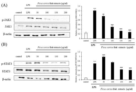Effect on F. carica fruit extracts on p-JAK1 and p-STAT3 expressions of RAW 264.7 cells. The expressions of p-JAK1 (A) and p-STAT3 (B) were analyzed with ImageJ and normalized against β-actin. All data are expressed as mean ± SD *** p < 0.001 compared with control group, ## p < 0.01 compared with LPS group, ### p < 0.001 compared with LPS group. All experiments were performed in triplicate.