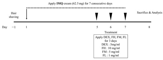 The scheme of animal experiments conducted to investigate the psoriasis-improvement effect of F. carica fruit extracts. IMQ, Imiquimod; DEX, dexamethasone; FH, high-dose Ficus carica extract; FM, moderate-dose Ficus carica extract; FL, low-dose Ficus carica extract.