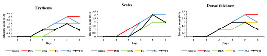 The PASI score evaluates the severity of psoriasis by measuring the degree of redness (erythema), thickness, scales of the psoriasis lesion, and the extent of psoriasis spread. Figure 9 shows that all indicators, such as erythema, scales, and dorsal thickness, steadily increased in the IMQ-treated group. However, the scores for erythema, scales, and dorsal skin thickness decreased after FFE treatment. In particular, the high-concentration FFE treatment group showed an improvement similar to that of the positive control group (dexamethasone).