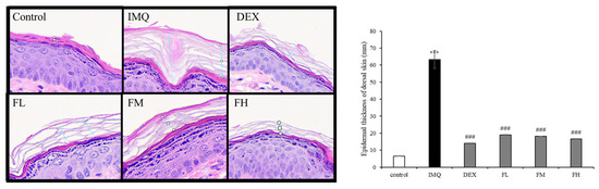 Histological examinations stained with hematoxylin and eosin (H&E). H&E-stained dorsal skin of control and IMQ-treated mice. Images magnified 40×. *** p < 0.001 compared with control group, ### p < 0.001 compared with IMQ. All experiments were performed in triplicate.