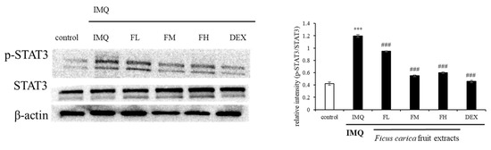 Effect of F. carica fruit extracts on the phosphorylation of STAT3. The expression of p-STAT3 was analyzed with ImageJ and normalized against β-actin. All data are expressed as mean ± SD *** p < 0.001 compared with control group, ### p < 0.001 compared with IMQ group. All experiments were performed in triplicate.