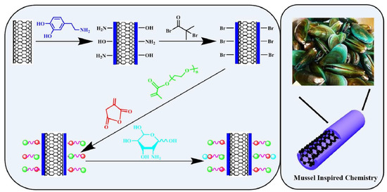 Another approach involves the use of mussel-inspired chemistry for polymer modification. Mussel-inspired strategies have been employed to modify natural polysaccharides, such as alginate, in biomedical applications, expanding their uses in tissue engineering, wound healing, drug delivery, and biosensors [16]. By employing glycosylation and PEGylation techniques, researchers have successfully enhanced the dispersibility and cytocompatibility of carbon nanotubes for potential biomedical applications (Figure 2) [14]. Additionally, mussel-inspired surface molecular imprinting polymers on reduced graphene oxide have demonstrated excellent electrocatalytic activity and selectivity, enabling sensitive and selective electrochemical sensing [30].