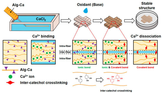 Schematic illustration of preparation of wet-spun Alg-Ca fibers and their 3D fibrous constructs with oxidative treatment. The fibers and their 3D structure are fabricated using initial ionic bonds followed by inter-catechol crosslinking even after dissociation of ionic bond [15].