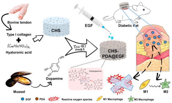 In addressing the specific needs of diabetic wounds, a mussel-inspired bioactive scaffold has shown promise. This scaffold is composed of collagen and hyaluronic acid, modified with polydopamine, and loaded with endothelial growth factor (EGF). It exhibits properties that promote wound healing, reduce inflammation, and address the unique challenges associated with diabetic wounds. Such mussel-inspired bioactive scaffolds hold potential as low-cost wound dressings for diabetic patients [65]. Figure 6 shows EGF-loaded collagen-hyaluronic acid (CHS)- polydopamine nanoparticles (PDA) may be a proper choice for clinical tissue engineering applications to improve chronic wound repair.
