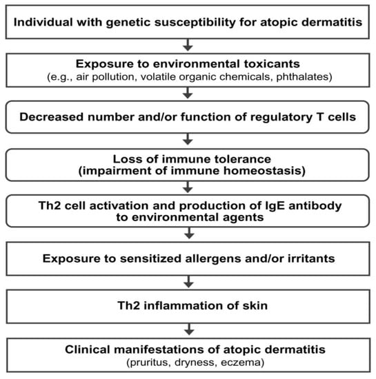 AD is a multifactorial disorder caused by multiple pathogenic elements, including genetic predisposition, environmental triggers, immune dysfunction, hypersensitivity reaction, chronic skin inflammation, and skin barrier defect [2,3]. Unfortunately, the precise interactions among the multiple pathogenic elements involved in the development and maintenance of AD are not fully understood. Epidemiological and experimental evidence suggests that an impairment of immune tolerance state caused by decreased number and/or function of Treg cells resulting from the exposure to various environmental toxicants is responsible for a rapidly increased prevalence of allergic diseases in the industrialized world [3,11,12,13,14]. In this hypothetical pathogenesis model for AD, a human subject with a genetic predisposition for the development of AD is exposed to environmental toxicants (such as air pollution, volatile organic chemicals, phthalates, and bisphenol A) through the respiratory mucosa, gastrointestinal mucosa, or skin. The exposure to environmental toxicants decreases the number and/or function of Treg cells and impairs immune homeostasis (loss of immune tolerance state) in the subject. The toxicant-induced decreased number and/or function of Treg cells induces hypersensitivity in the human subject through the activation of Th2 cells and the development of an IgE response to common environmental agents. Exposure to sensitized allergens and/or chemical irritants induces a hypersensitivity reaction and chronic inflammation of the skin, which induces and maintains the clinical manifestations of AD (pruritus, dryness, and eczema) (Figure 1).