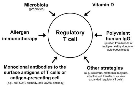 The Treg cell-targeted immunomodulatory therapies for AD include allergen immunotherapy, microbiota, vitamin D, polyvalent human immunoglobulin G (IgG), monoclonal antibodies to the surface antigens of T cell or antigen-presenting cell, and adoptive transfer of autologous Treg cells or genetically engineered Treg cells expanded in vitro (Table 3).