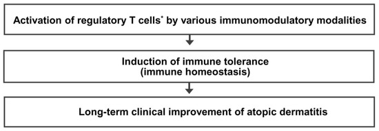 Atopic dermatitis (AD) is a chronically relapsing inflammatory skin disorder characterized by itching and eczematous lesions. It is often associated with a personal or familial history of allergic diseases [1,2,3]. Hypersensitivity reaction (allergic reaction) to environmental agents has been suggested as a pathogenetic mechanism responsible for the development and maintenance of chronic skin inflammation in patients with AD [3]. However, the precise pathogenetic mechanism underlying AD remains unclear. The standard therapies for AD, including topical corticosteroids or calcineurin inhibitors, focus on controlling skin inflammation [1,2,3]. A significant number of patients with AD can be further improved by systemic immunomodulatory agents including corticosteroids, cyclosporine, or methotrexate. However, there are toxicity risks associated with prolonged use of these compounds [3]. Monoclonal antibody to interleukin (IL)-4 receptor alpha and Janus kinase inhibitors suppressing T-helper type 2 (Th2) cell-mediated inflammation can provide significant clinical improvement in patients with moderate-to-severe AD [4,5,6,7]. These findings demonstrate that hypersensitivity reactions mediated by Th2 cells play a key role in the pathogenesis of AD [4,5,6,7]. These results also demonstrate that AD is a systemic immune disease, and that systemic immunomodulation is an efficient strategy for the treatment of AD. However, the Th2-targeted therapy could not modulate upstream immune dysfunction causing Th2 cell activation and could not provide a long-term clinical improvement (LTCI) of AD. Thus, further development of novel therapeutic modalities for AD that can improve a long-term clinical outcome and provide a long-term treatment-free clinical remission of AD (disease-modifying therapy) is required. Studies in patients with AD and AD mouse models have shown that immune dysfunction caused by a decreased number and/or function of regulatory T (Treg) cells is critical for Th2 cell activation and immunoglobulin E (IgE)-mediated inflammation [8,9]. Therefore, an immunomodulatory strategy that activates Treg cells is an ideal therapeutic approach to induce immune tolerance and achieve an LTCI of AD. This review provides hypotheses and perspectives on immunomodulatory strategies that activate Treg cells to achieve an LTCI of AD by induction of immune tolerance through antigen-dependent and/or antigen-independent stimulations.