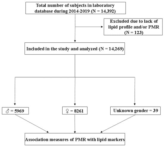Ethical clearance for this retrospective, cross-sectional study was obtained from Al Borg Diagnostics (IRB approval #07/12). Age, gender, and laboratory records that permitted the calculation of PMR were available for 14,269 subjects aged from 4 to 106 years old (Figure 1). A total of 39 subjects (0.27%) were of unknown age and gender, while 865 (6.06%) were 4–17 years of age, 6707 (47.0%) were 18–39 years of age, 5470 (38.33%) were 40–64 years of age, and 1188 (8.32%) were 65–106 years of age.