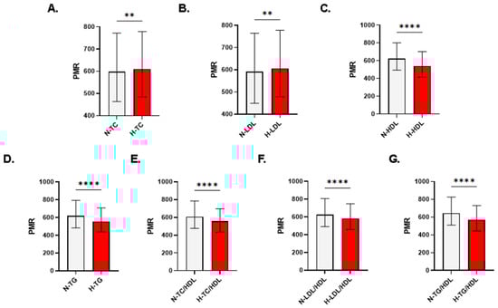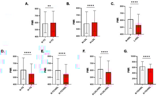 Patterns of PMR in light of lipid markers in both genders. Medians ± IQR of PMR in individuals with normal and abnormal (A) TC, (B) LDL, (C) HDL, (D) TG, (E) TC/HDL, (F) LDL/HDL, and (G) TG/HDL. N, normal; H, high; L, low. Significance is indicated by ** p < 0.01 and **** p < 0.0001.