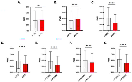 Patterns of PMR in light of lipid markers in males. Medians ± IQR of PMR in males with normal and abnormal (A) TC, (B) LDL, (C) HDL, (D) TG, (E) TC/HDL, (F) LDL/HDL, and (G) TG/HDL. N, normal; H, high; L, low. Significance is indicated by ns (i.e., not significant) and **** p < 0.0001.