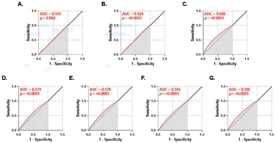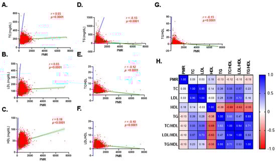We performed a ROC curve analysis in order to evaluate the clinical utility of PMR as a diagnostic tool to discriminate individuals with normal lipid markers and those with dyslipidemia. Figure 6 indicates that the highest AUC was 0.608 (p < 0.0001), which was obtained for HDL (Figure 6C) followed by that for TG/HDL at 0.596 (p < 0.0001) as shown in Figure 6G. Of note, the very small p values provide evidence that the PMR had the ability to distinguish between subjects with normal and abnormal lipid markers.