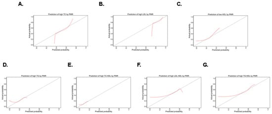 PMR would detect 40–45% of individuals at a moderate risk to have high TC (Figure 7A), 75–80% of subjects at a high risk to have elevated LDL (Figure 7B), 18–30% of those at a low risk to have decreased HDL (Figure 7C), 18–25% of people at a low risk to have high TG (Figure 7D), 5–18% of subjects at a low risk to have an increased TC/HDL ratio (Figure 7E), 45–60% of individuals at a moderate risk to have an increased LDL/HDL ratio (Figure 7F), and 45–60% of those who are at a moderate risk to have an elevated TG/HDL ratio (Figure 7G). The calibration curves also revealed distinct patterns in which PMR overestimates and underestimates abnormal lipid markers.