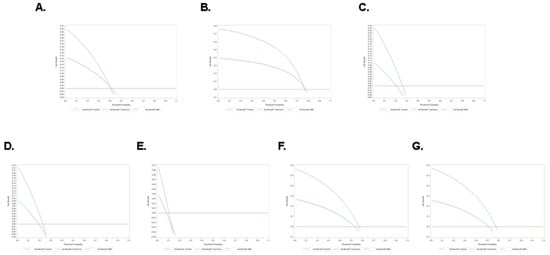 The clinical net benefit and threshold probability of PMR were 0.21 and 0.47 for treating elevated TC (Figure 8A), 0.4 and 0.8 for treating elevated LDL (Figure 8B), 0.1 and 0.27 for treating low HDL (Figure 8C), 0.09 and 0.26 for treating high TG (Figure 8D), 0.38 and 0.17 for treating high TC/HDL (Figure 8E), 0.28 and 0.58 for treating high LDL/HDL (Figure 8F), and 0.26 and 0.55 for treating high TG/HDL (Figure 8G).