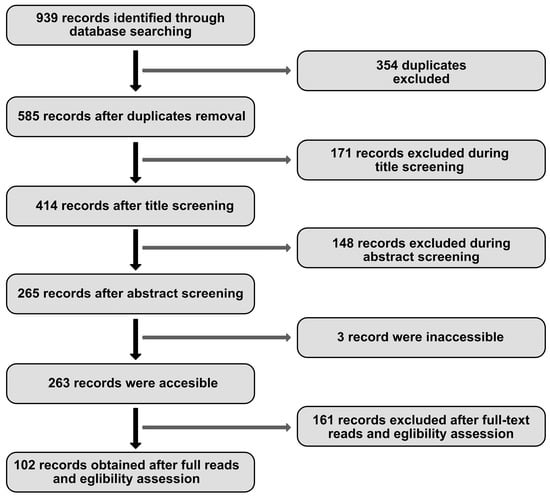 This paper aims to present current knowledge on the impact of MCs on the development of selected musculoskeletal diseases and provide, where possible, differing views on these issues. For this purpose, a literature search of publications released since 2010 was carried out on 1 February 2023 using the PubMed database. The main query entered into the search engine was “musculoskeletal diseases AND mast cell”, yielding 477 results. To ensure that the search would include musculoskeletal entities, which were also a point of interest for the authors, the following queries were also entered: “muscular diseases AND mast cell”; “rheumatoid arthritis AND mast cell”; “gout AND mast cell”; “psoriatic arthritis AND mast cell”; “myopathy AND mast cell”; “spondyloarthritis AND mast cell”; “Ehlers-Danlos Syndrome AND mast cell”. A total of 939 records were identified via PubMed search. After removing duplicates, 585 results remained. The next step was to check the results, which was performed independently by two researchers, and discrepancies were discussed. Finally, 483 articles were excluded based on titles (n = 171), abstracts (n = 148), full-text reads (n = 161), and due to being inaccessible (n = 3) (see Figure 1). Articles addressing issues unrelated to this review were discarded, which included neoplasms, animal diseases, skin diseases, oral diseases, neurological diseases, dietary recommendations, studies focusing exclusively on an active substance, and studies on which scientific quality was found to be objectionable. Due to the voluminous nature of the work, it was also decided not to describe bone diseases, including osteoarthritis. One hundred two papers were selected and used as the basis of this review.