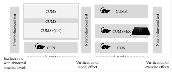 After 5 weeks of CUMS modeling, the EX + CUMS rats were subjected to an adaptive treadmill exercise program with a 0-degree slope, 15 m/min, 60 min/day, 6 days/week of moderate intensity for 8 weeks (Figure 1).