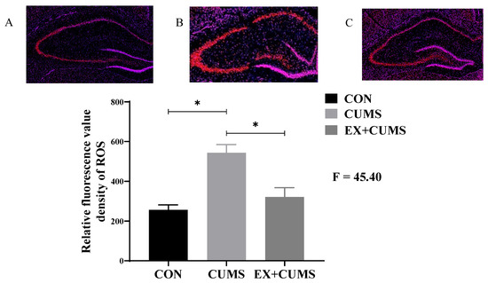 Immunofluorescence staining results showed that compared to the CON group, ROS levels in the hippocampus of the CUMS group rats significantly increased (p < 0.05). After aerobic exercise intervention, ROS levels in the hippocampus tissue of the EX + CUMS group rats were significantly suppressed, and the difference between the EX + CUMS group and CUMS group was statistically significant (p < 0.05) (Figure 2).