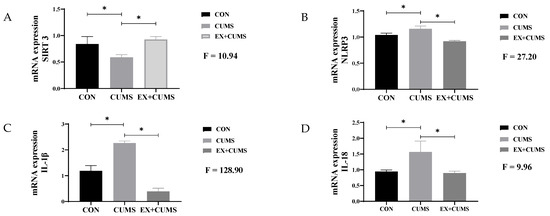 The effects of aerobic exercise on mRNA expression in CUMS-induced depressed rats. Note: (A) indicates SIRT3, (B) indicates NLRP3, (C) indicates IL-1β, (D) indicates IL-18. * Indicates that the difference between the two groups is significant.