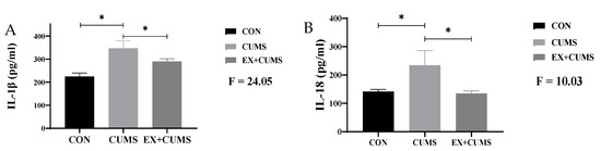 Compared to the CON group, the levels of inflammatory cytokines in the hippocampus tissue of CUMS group rats significantly increased (p < 0.05). After aerobic exercise intervention, the levels of IL-1β and IL-18 inflammatory cytokines in the hippocampus tissue of rats was significantly suppressed, and the difference between the EX + CUMS group and CUMS group was statistically significant (p < 0.05) (Figure 5).