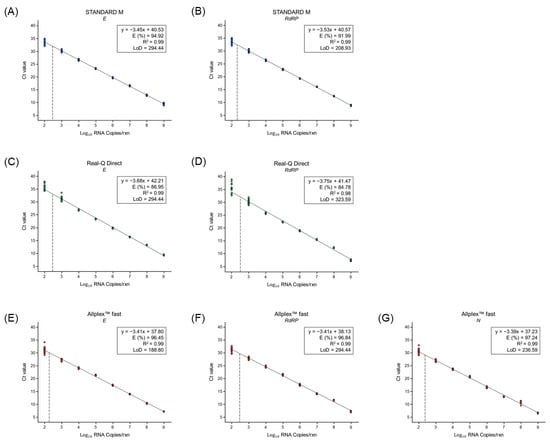 Correlation between the Ct values and SARS-CoV-2 B.1.351 RNA at eight concentrations, as analyzed using linear regression based on LoD experiments. Graphs prepared using the results of the STANDARD M kit for (A) E and (B) RdRP; the Real-Q Direct kit for (C) E and (D) RdRP; and the Allplex™ fast kit for (E) E, (F) RdRP, and (G) N. Percentage efficiency was calculated from the slope using the formula E (%) = 100 × (−1 + 10−1/slope). Circles represent the results of each test, and 24 replicates were used per concentration. The dotted line represents the LoD value. E, envelope gene; RdRP, RNA-dependent RNA polymerase gene; N, nucleocapsid gene; Ct, Cycle threshold; and LoD, limit of detection.