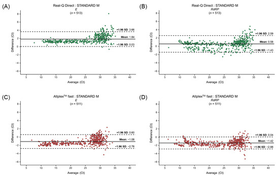 Based on the similar analytical performance, the clinical performance of the two rapid RT-qPCR kits was evaluated using 1133 individual clinical samples (Table 2 and Table 3). For the Real-Q Direct kit, the sensitivity was 98.28% and the specificity was 99.51%. For the Allplex™ fast kit, the sensitivity was 97.89% and the specificity was 99.84%. The clinical performance of each rapid RT-qPCR kit and STANDARD M kit showed a high association (κ = 0.98). In addition, the distribution of differences in the results was analyzed based on the same target genes (E and RdRP), focusing on the average Ct values of the STANDARD M kit and each rapid RT-qPCR kit (Figure 2). It was confirmed that approximately 95% of the similarity values originated from the Real-Q Direct and Allplex™ fast kits around the average.