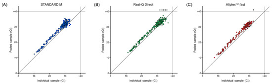 Comparison of Ct values between individual and pooled samples, as tested with the (A) STANDARD M, (B) Real-Q Direct, and (C) Allplex™ fast kits. Samples that were negative are marked with gray dots beyond the dotted line. The x-axis represents the average Ct value of individual samples, and the y-axis represents the average Ct value of pooled samples. Ct, cycle threshold.