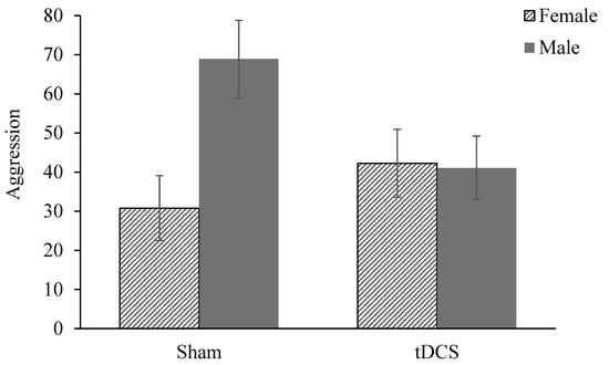 On average, males exhibited more aggressive responding (mean = 52.35, SD = 45.14) compared to females (mean = 36.27, SD = 37.93; p = 0.07). Additional analysis conducted to examine gender effects revealed that in males, there was a main effect of stimulation on aggression, F (1, 40) = 4.15, p = 0.048. Compared with males who received sham stimulation, those who received anodal stimulation over the prefrontal cortex engaged in lower levels of aggression after tDCS (Figure 2). However, this pattern of findings was not found in females. A non-significant increase in aggression was found in females who received active stimulation compared with those in the sham group, F (1, 44) = 1.05, p = 0.31.
