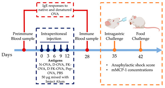 The IP sensitization route induces more robust IgE responses against OVA than the oral/intragastric one [10]. Thus, a 28-day IP sensitization protocol with adjuvant was used (Imject Alum, Thermo Scientific, aluminum hydroxide 40 mg/mL; magnesium hydroxide 40 mg/mL) [11] (Figure 1). Mice were randomized into six experimental groups (n = 6). The treatments were as follows: (1) N-OVA, (2) D-OVA, (3) FK-OVA, (4) D FK-OVA, (5) Pep-OVA, and (6) Control (PBS). IP administrations (50 μg of antigen in 100 μL of PBS mixed with 100 μL Imject Alum) were carried out on days 0, 3, 6, 9, and 12. The control group received PBS only. Blood samples were collected 2 days before (preimmune sample) and 28 days after (immune sample) the first IP injection (day 0). Blood samples were centrifuged at 6000 rpm at room temperature for 15 min, and serum samples were collected and stored at −80 °C until their use for IgE antibody analysis.