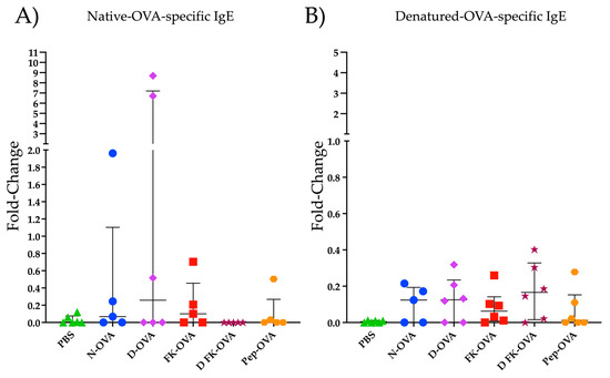 IgE reactivity to N-OVA and D-OVA. (A) IgE reactivity to N-OVA was expressed as fold-change. (B) IgE reactivity to D-OVA was expressed as fold-change. The data are presented as the median and interquartile range. Acronyms used: PBS: phosphate-buffered saline; N-OVA: native ovalbumin; D-OVA: denatured ovalbumin; FK-OVA: formaldehyde and lysine-treated ovalbumin; DFK-OVA: formaldehyde and lysine-treated denatured ovalbumin; Pep-OVA; ovalbumin peptides. The interquartile range is represented by the lines. Each experimental group is denoted by a distinct shape: PBS by a triangle, N-OVA by a circle, D-OVA by a diamond, FK-OVA by a square, DFK-OVA by a star, and pep-OVA by a hexagon.