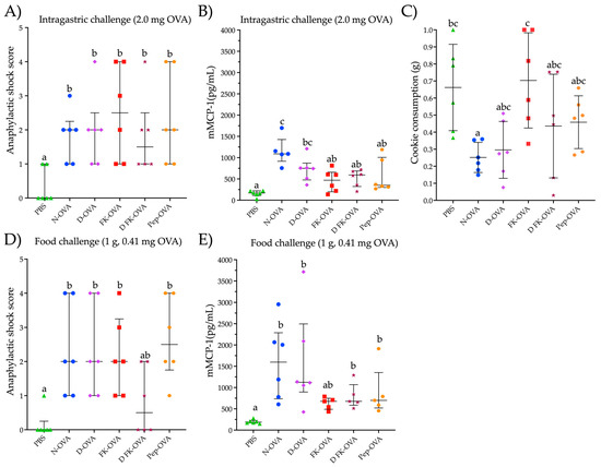 Parameters evaluated after intragastric or oral food challenges. (A) Anaphylactic shock score after an intragastric challenge with 2.0 mg of N-OVA. (B) mMCP-1 serum levels after 30 min of an intragastric challenge with 2.0 mg of OVA. (C) Consumption of the cookie after 60 min of exposure to it. (D) Anaphylactic shock score after a food challenge with a cookie containing 0.41 mg of OVA. (E) mMCP-1 serum levels after 60 min of a food challenge with a cookie containing 0.410 mg of OVA. Data are presented as median and interquartile range in the (A,B,D,E) sections, and as median and standard deviation in the (C) section. Different letters indicate statistical differences (p < 0.05). Acronyms used: OVA: ovalbumin; PBS: phosphate-buffered saline; N-OVA: native ovalbumin; D-OVA: denatured ovalbumin; FK-OVA: formaldehyde and lysine-treated ovalbumin; DFK-OVA: formaldehyde and lysine-treated denatured ovalbumin; Pep-OVA; ovalbumin peptides; mMCP-1: mouse mast cell protease-1. Each experimental group is denoted by a distinct shape: PBS by a triangle, N-OVA by a circle, D-OVA by a diamond, FK-OVA by a square, DFK-OVA by a star, and pep-OVA by a hexagon.