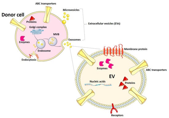 Extracellular vesicles (EVs) are nanoparticles released by almost all cells of the organism to the extracellular space. They have been categorized into exosomes, microvesicles (also known as microparticles or ectosomes), and apoptotic bodies, depending on their biogenesis and size range. Exosomes originate from membrane endosomal compartments after the endocytosis of fragments of the plasma membrane and are secreted to the extracellular space and biological fluids as particles with a diameter between 30 and 150 nm [44,45]. During endocytosis, membranes and soluble proteins are loaded into the endocytic compartments. Proteins from the Golgi complex are loaded into the endosomes, as well [44]. Exosomes are characterized by the presence of tetraspanins (e.g., CD9, CD63, CD81) and other proteins, such as flotillin and TSG101 (tumor susceptibility gene 101) [44]. Microvesicles exhibit a wider size range (up to 1000 nm) and are released by outward budding of the plasma membrane. Apoptotic bodies have a specialized function during programmed cell death and are beyond the scope of this manuscript [45]. So far, EVs have been described as mediators of cell–cell communication in physiological and pathophysiological situations. Participation of EVs in processes such as the immune response and reproduction has been described. Also, signaling by EVs has been associated with the pathogenesis of metabolic disorders and cancer [44]. In this article, we will use the term EVs, following the recommendations and guidelines of the International Society for Extracellular Vesicles [46], to refer to exosomes and microvesicles, as most isolation and analysis methods cannot clearly distinguish both types of EVs.