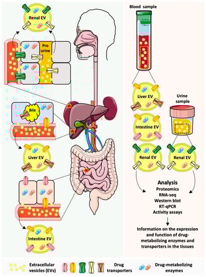 EVs as surrogates of DMEs and drug transporter expression and activity. Left panel: hepatocytes, enterocytes, and renal tubular cells constitute the major cell types involved in drug absorption, metabolism, and excretion. DME enzymes mediate the biotransformation of drugs, while drug transporters are membrane proteins that mediate the drug uptake into the cell or the efflux to the extracellular space (bile in the case of hepatocytes, intestinal lumen in the case of enterocytes, and pro-urine in the case of renal tubular cells; the basolateral efflux to the blood can also take place). All these cells release EVs carrying DMEs and drug transporters to the blood and, in the case of renal cells, also the urine. The cargo of the EVs may reflect the composition of the cell of origin. Right panel: intestinal and hepatic EVs can be isolated from blood, while renal EVs can be isolated from blood and urine. EVs can be subjected to different analytical methods with the aim of investigating the DME and transporter expression. Also, the activity of DMEs in EVs can be determined. This information may reflect the expression and activity in the tissues of origin and, therefore, contribute to estimating the drug-metabolizing and excretion capacity of an individual in a minimally invasive way. The figure was created using pictures from Servier Medical Art by Servier (Suresnes, France), licensed under a Creative Commons Attribution 3.0 Unported License.