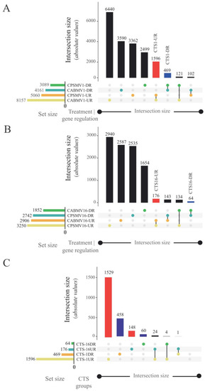 UpSet plots generated to highlight the formation of different CTS groups in response to CABMV and CPSMV mechanical inoculation. Each horizontal column represents an original dataset, and the bar charts at the top indicate the resultant dataset size after comparison with the others. Each line represents a potential intersection: filled-in cells connected by lines indicate which datasets are part of an intersection. Red and blue bars indicate up-regulated and down-regulated CTS groups, respectively. (A) Set of differentially expressed transcripts for the one hour post-inoculation (hpi) treatments and their resulting CTS groups. (B) Set of differentially expressed transcripts for the 16 hpi treatments and their resulting CTS groups. (C) The comparison of CTS groups of different temporal scales. Legend: CTS (Conserved Transcriptional Signatures); CPSMV1-UR group (up-regulated transcripts in the CPSMV mechanical inoculation assay at one hour post-inoculation); CPSMV16-UR group (up-regulated transcripts in the CPSMV mechanical inoculation assay at 16 hpi); CPSMV1-DR group (down-regulated transcripts in the CPSMV mechanical inoculation assay at one hpi); CPSMV16-DR group (down-regulated transcripts in the CPSMV mechanical inoculation assay at 16 hpi); CABMV1-UR group (up-regulated transcripts in the CABMV mechanical inoculation assay at one hpi); CABMV16-UR group (up-regulated transcripts in the CABMV mechanical inoculation assay at 16 hpi); CABMV1-DR group (down-regulated transcripts in the CABMV mechanical inoculation assay at one hpi); CABMV16-DR group (down-regulated transcripts in the CABMV mechanical inoculation assay at 16 hpi); CTS-1UR group (up-regulated transcripts in response to CABMV and CPSMV mechanical inoculations at one hpi treatments); CTS-1DR group (down-regulated transcripts in response to CABMV and CPSMV mechanical inoculations, at one hpi treatments); CTS-16UR group (up-regulated transcripts in response to CABMV and CPSMV mechanical inoculations, at 16 hpi treatments); CTS-16DR group (down-regulated transcripts in response to CABMV and CPSMV mechanical inoculations, at 16 hpi treatments).