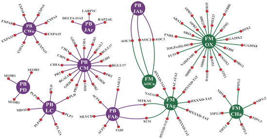 Interaction network* for CTS-1UR enriched GO terms in the MF (molecular function) and BP (biological process) categories. The central circles (in purple for BP and green for MF) represent the enriched GO term, while the side circles (in red) correspond to the proteins comprising the respective term. Legend: *Adapted from the NeVOmics tool output. CWo (plant-type cell wall organization); LC (lipid catabolic process); FAb (fatty acid biosynthetic process); PD (phloem development); CM (carbohydrate metabolic process); JAb (jasmonic acid biosynthetic process); JAr (response to jasmonic acid); AOCa (allene-oxide cyclase activity); CHa (channel activity); TAg (transferase activity, transferring acyl groups other than amino-acyl groups); OX (oxidoreductase activity); CTS-1UR group (up-regulated transcripts in response to CABMV and CPSMV mechanical inoculations, at one hpi treatments); hpi (hours post inoculation).