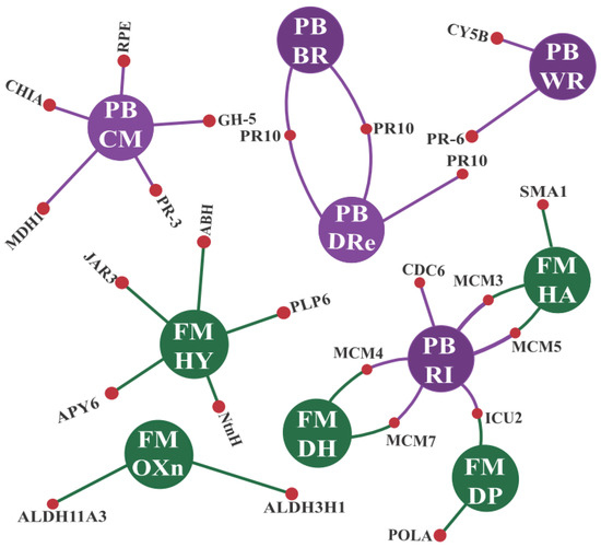 Interaction network* for CTS-16UR enriched GO terms in the MF (molecular function) and BP (biological process) categories. The central circles (in purple for BP and green for MF) represent the enriched GO term, while the side circles (in red) correspond to the proteins comprising the respective term. Legend: *Adapted from the NeVOmics tool output. RI (DNA replication initiation); WR (response to wounding); BR (response to biotic stimulus); DRe (defense response); CM (carbohydrate metabolic process); DP (DNA primase activity); DH (DNA helicase activity); HA (helicase activity); OXn (oxidoreductase activity, acting on the aldehyde or oxo group of donors, NAD or NADP as acceptor; HY: hydrolase activity); CTS-16UR group (up-regulated transcripts in response to CABMV and CPSMV mechanical inoculations, at 16 hpi treatments); hpi (hours post inoculation).