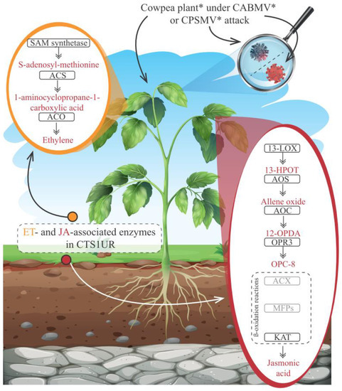 Schematic representation of a cowpea plant* under attack by CABMV* or CPSMV*, highlighting the ethylene (ET) and jasmonic acid (JA) biosynthesis pathways and emphasizing the enzymes (inside black rectangles) belonging to the CTS-1UR group. Legend: *for illustrative purposes only; enzymes inside gray rectangles showed constitutive expression in the both analyzed assays; ET (Ethylene); JA (jasmonic acid); SAM synthetase (S-adenosylmethionine synthetase); ACS (1-aminocyclopropane-1-carboxylate synthase); ACO (1-aminocyclopropane-1-carboxylate oxidase); 13-LOX (13-lipoxygenase); 13-HPO (13(S)-linolenic acid hydroperoxide); AOS (allene oxide synthase) AOC (allene oxide cyclase); ACX (acyl-CoA-oxidase); 12-OPDA (cis (+)-12-oxo-fitodienóico)); OPR3 (OPDA reductase); OPC8 (3-oxo-2-(2-pentenyl)-cyclopentane-1-octanoic acid); MFP (multifunctional proteins); KAT (L-3-ketoacyl-CoA-thiolase); CTS-1UR group (up-regulated transcripts in response to CABMV and CPSMV mechanical inoculations, at one hpi treatments); hpi (hours post inoculation).