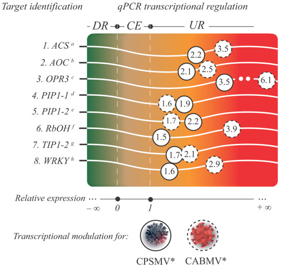 A gradient chart is presented, showcasing the analyzed targets from the CTS-1UR group, showing their respective functional annotations and IDs (superscript letters). The color gradient represents the relative expression value, indicated by the numbers inside the circles, for each target and viral mechanical inoculation assay. Legend: * for illustrative purposes only; circles with dashed lines represent the relative expression levels of the target transcripts from the one hpi treatment in the CABMV mechanical inoculation assay, while circles with solid lines represent the same for the CPSMV mechanical inoculation assay. Targets displaying a relative expression value below zero and p < 0.05 are classified as down-regulated (DR), those between zero and one with p ≥ 0.05 are considered constitutively expressed (CE), and those greater than one with p < 0.05 are identified as up-regulated (UR); a Vung164007|c0_g1_i1 (ACS: 1-aminocyclopropane-1-carboxylate synthase); b Vung81738|c0_g1_i1 (AOC: allene oxide cyclase); c Vung115541|c1_g5_i8 (OPR3: OPDA reductase); d Vung136249_c0_g4_i2 (PIP1-1: aquaporin PIP1-1); e Vung47464_c4_g4_i1 (PIP1-2: aquaporin PIP1-2); f Vung150570|c0_g1_i7 (Rboh: Respiratory burst oxidase homolog); g Vung59787_c1_g1_i4 (TIP1-2: aquaporin TIP1-2); h Vung50795|c1_g1_i3 (WRKY: WRKY transcription factor); CTS-1UR group (up-regulated transcripts in response to CABMV and CPSMV mechanical inoculations, with one hpi treatments); hpi (hours post-inoculation).