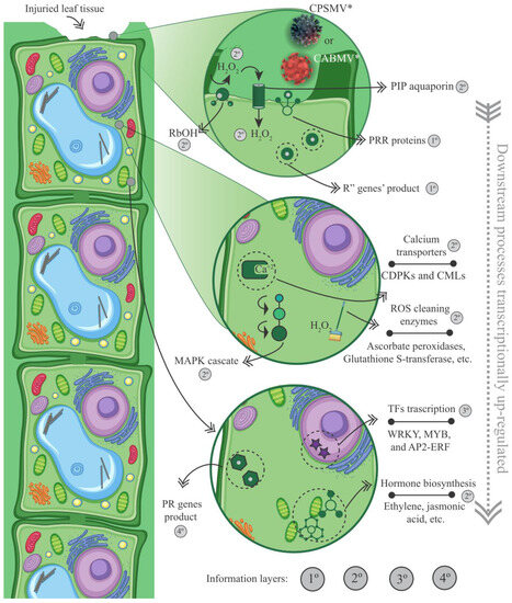 Additionally, transcripts coding for molecular players involved in various signaling pathways, such as calcium-mediated signaling and MAPK signaling cascades, were up-regulated in the one hpi treatment. The scientific literature has reported that the plant host utilizes calcium signaling as a mechanism to effectively combat viral invasion. Viral infections can induce various stress-related injuries, leading to an excessive calcium influx in some plant cell components. This calcium influx can result in different forms of cell death, such as necrosis, apoptosis, and autophagic cell death. These cellular demise processes serve as crucial barriers that hinder the spread of the virus to adjacent cells and surrounding tissues (for a comprehensive review, see [61]).