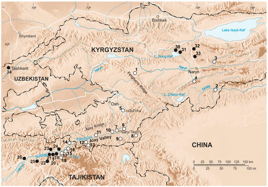 Map of collection points. Collection localities of E. alaicus specimens are marked with white circles; collection localities of E. tancrei are marked with black circles. The names of the studied localities are given in Table S1. Points 35–37 are beyond the boundaries of this map fragment.