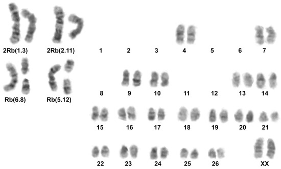 - Ford, C.E.; Hamerton, J.L. A colchicine, hypotonic citrate, squash sequence for mammalian chromosomes. Stain. Technol. 1956, 31, 247–251. [Google Scholar] [CrossRef] [PubMed]