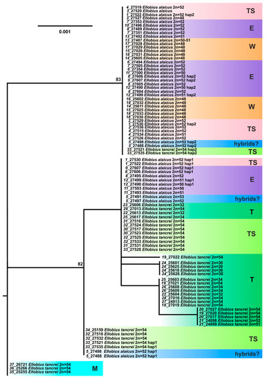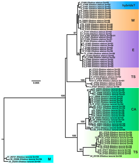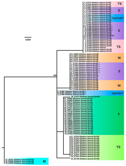 The images of phylogenetic trees were rendered in FigTree 1.4.4 (http://tree.bio.ed.ac.uk/software/figtree/ (accessed on 25 November 2018)) and processed in Paint Shop Pro X2 (Corel). All trees were rooted on the E. tancrei samples from Mongolia as the most distant comparing with other populations.