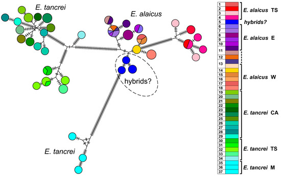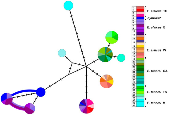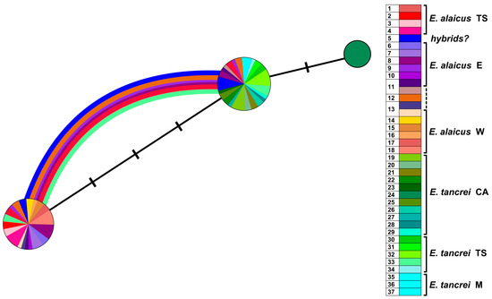 Haplotype network constructed by HaplowebMaker based on the XIST gene sequences of 82 specimens of E. tancrei and E. alaicus (see Table S1). A sample from each locality is colored with its own color; close shades unite species/intraspecific forms, according to investigated taxonomic hypotheses. The circles represent haplotypes; the curves between them indicate hybrid individuals, carrying both connected haplotypes. The area of the circles and the thickness of the curves are proportional to the number of individuals carrying the haplotype; nucleotide substitutions are indicated by dashes.