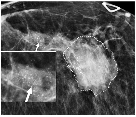 Mammogram showing density corresponding to a palpable mass (see dashed lines) as well as suspicious microcalcifications (arrows) and inset image showing magnified view of white punctate calcifications extending beyond the palpable mass.