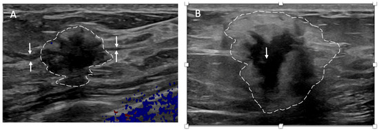 (A) shows dark, dominant, irregular mass encircled by hash marks with intraductal tumor extensions (dark bands bracketed by paired arrows) extending from left and right sides of dominant mass. (B) shows dark, irregular dominant mass (arrow) surrounded by peri-tumoral edema outlined by hash marks.