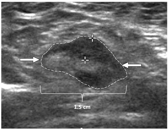 Hash marks outline abnormal appearing axillary lymph node measuring 1.5 cm in maximal diameter. Paired “+” marks indicate the span of a 0.4 cm area of focal cortical thickening that is suspicious for a metastatic deposit within the lymph node.