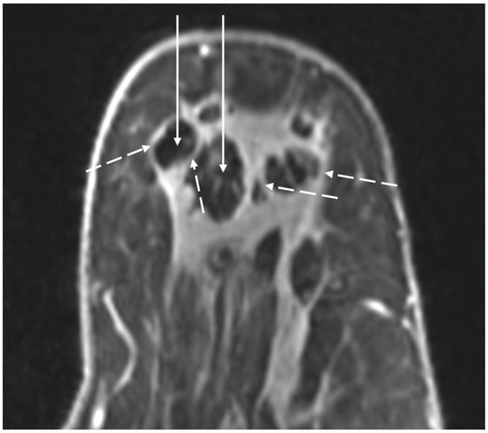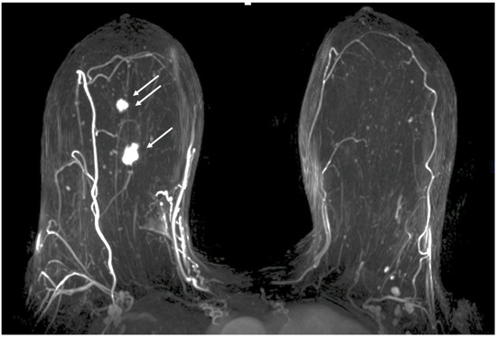 Contrast-enhanced breast MRI image showing multifocal disease indicated by mass-like enhancement of dominant mass (indicated by single arrow and encircled with hash marks) as well as mass-like enhancement of a second focus of disease (indicated by double arrows and encircled with hash marks). The second focus was mammographically-occult.