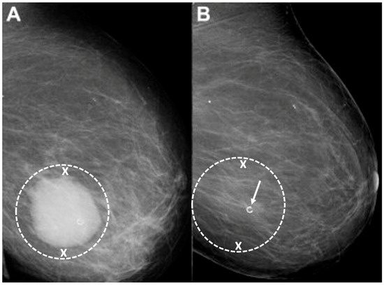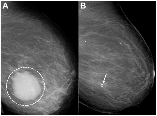 Mammogram performed before (A) pre-operative chemotherapy showing large, white, ultrasound visible cancer encircled by hash marks. After completing pre-operative chemotherapy, a repeat mammogram (B) of the same breast showed complete disappearance of the original cancer leaving only a circular metal biopsy site marker (arrow) to indicate the location of the original cancer.