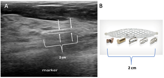 Ultrasound image (A) showing an example of a 2 cm long, basket-like, tubular, ultrasound-visible biopsy site marker (bracketed by paired arrows) that documents the location of ductal carcinoma in situ, which itself was not ultrasound visible. Image (B) shows an enlarged view of an actual basket-like marker and the shapes of various radio-opaque markers they may contain.
