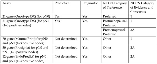 Table showing commercially available genomic assays for invasive breast cancer as indicated by the National Comprehensive Cancer Network guideline.